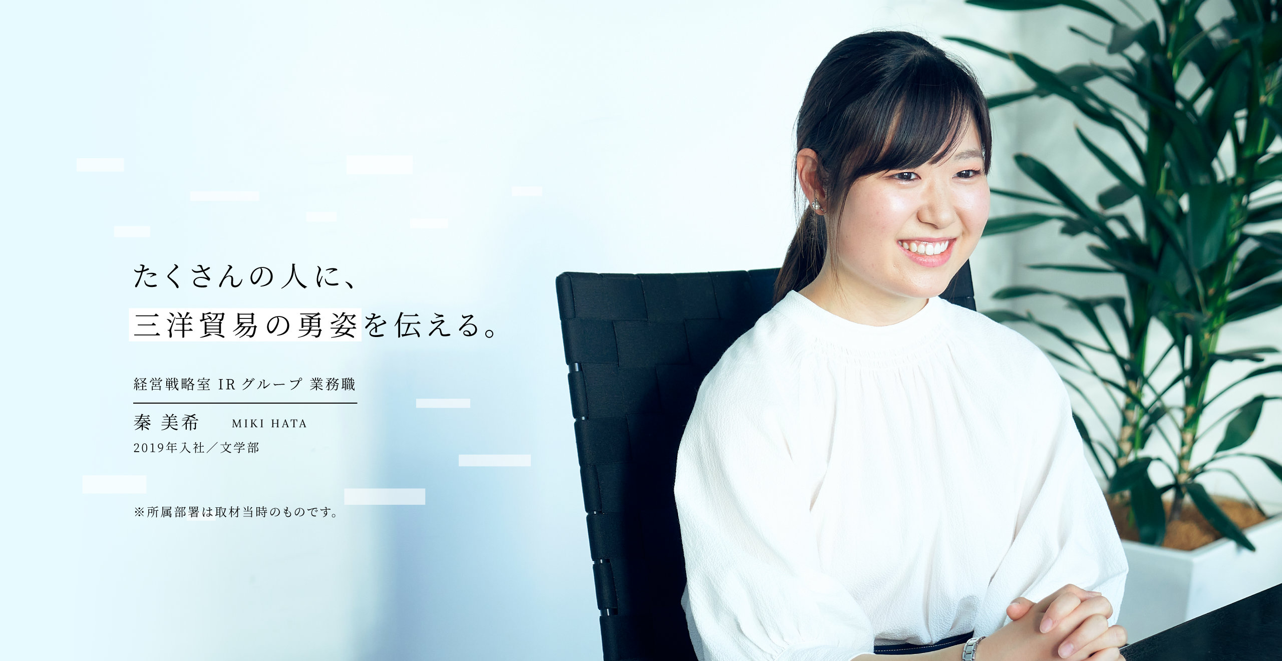 今後は三洋貿易の活動をより多くの方に知っていただくための新たな施策を考えていきたいと思います。当社のビジネスはBtoBなので、イメージが湧きづらいかもしれません。ですが、扱っているのはどれも世の中になくてはならないものです。投資家様だけでなく、もっと多くの方に当社の価値、そして社員一人ひとりの活躍を知っていただきたいです。まだ至らないことは多いのですが、仕事を通してさまざまなことを学んで、自由な発想でアイデアを出していきたいです。