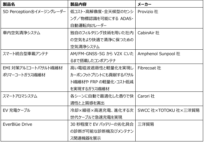 三洋貿易株式会社(本社:東京都千代田区、代表取締役社長:新谷正伸、以下「三洋貿易」)は、1月21日(水)から23日(金)まで開催される「第18回 オートモーティブ ワールド -クルマの先端技術展-」にモビリティ第一/第二事業部が出展します。ブースでは三洋貿易が取り扱う下記製品を展示します。