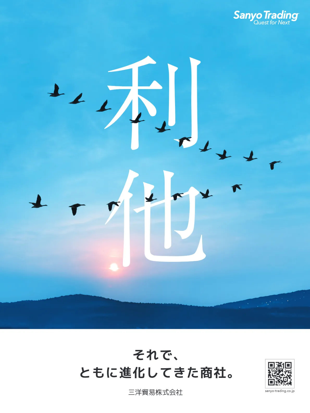 三洋貿易のバリュー(行動指針)である、「誠実」、「挑戦」、「迅速」、「変革」、「利他」をキーワードとし、言葉をイメージさせる風景と共にビジュアル化したシリーズ広告です。