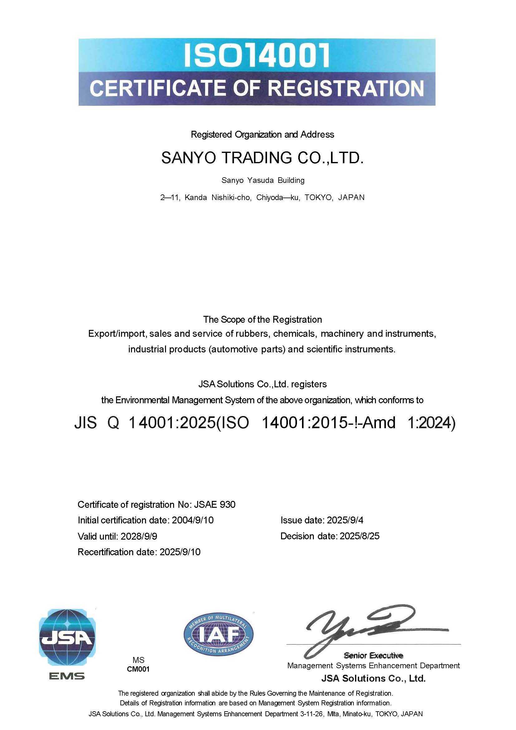 Sanyo Trading achieved ISO 14001 certification (registration), an environmental management system international standard, on September 10, 2004, for the business activities, products and services below at the Head Office, Osaka branch, Nagoya branch and Hiroshima office (achieved in 2020).