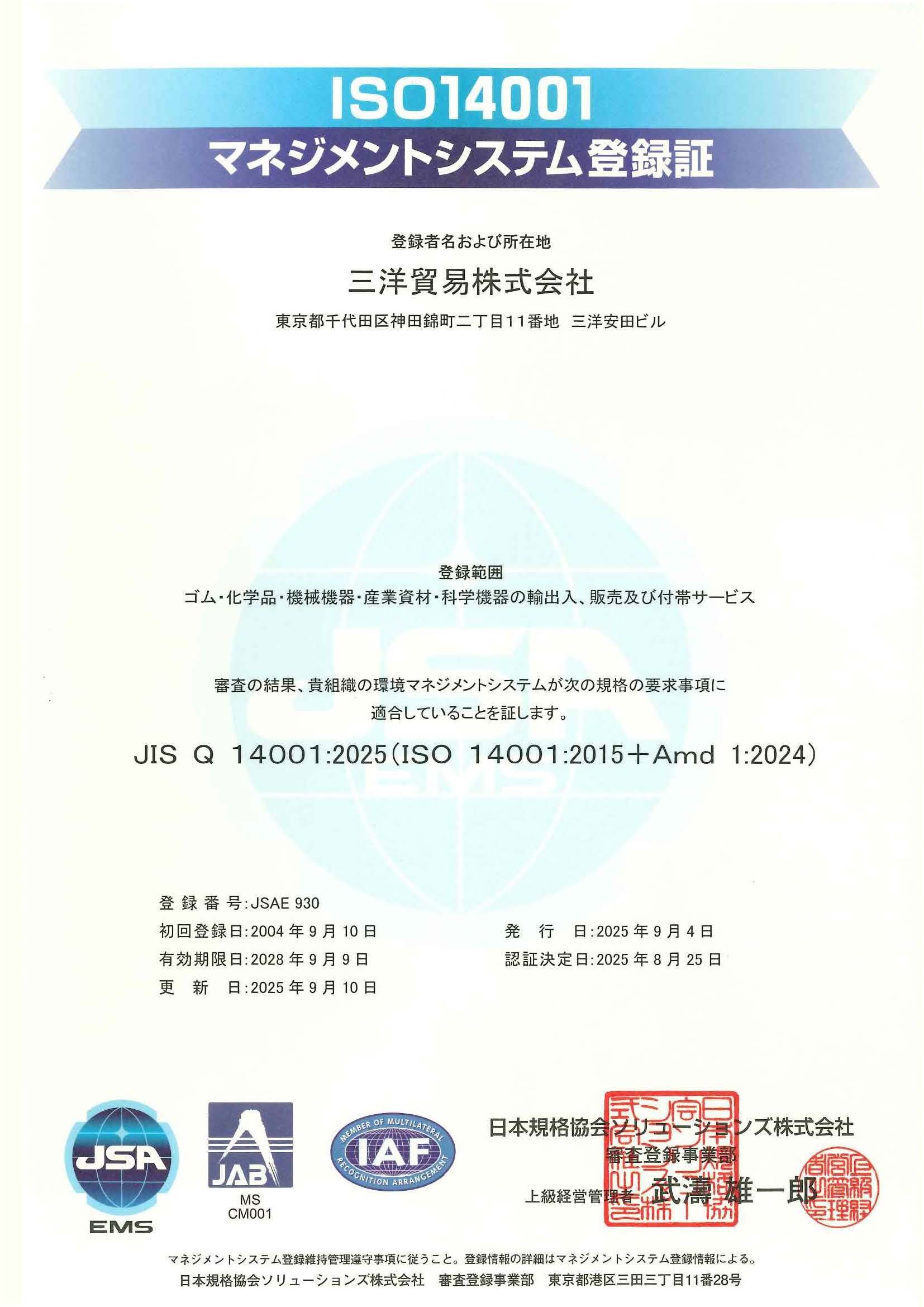 2004年9月10日付にて、環境マネジメントシステムの国際規格であるISO 14001の認証(審査登録)を本店、大阪、名古屋両支店、および広島事務所(2020年認証取得)の下記事業活動、製品およびサービスを対象に取得しました。